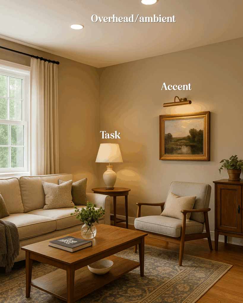 Lighting can make or break a room. Harsh overhead lights? Instant interrogation vibes. Warm, layered light? Cozy and welcoming.