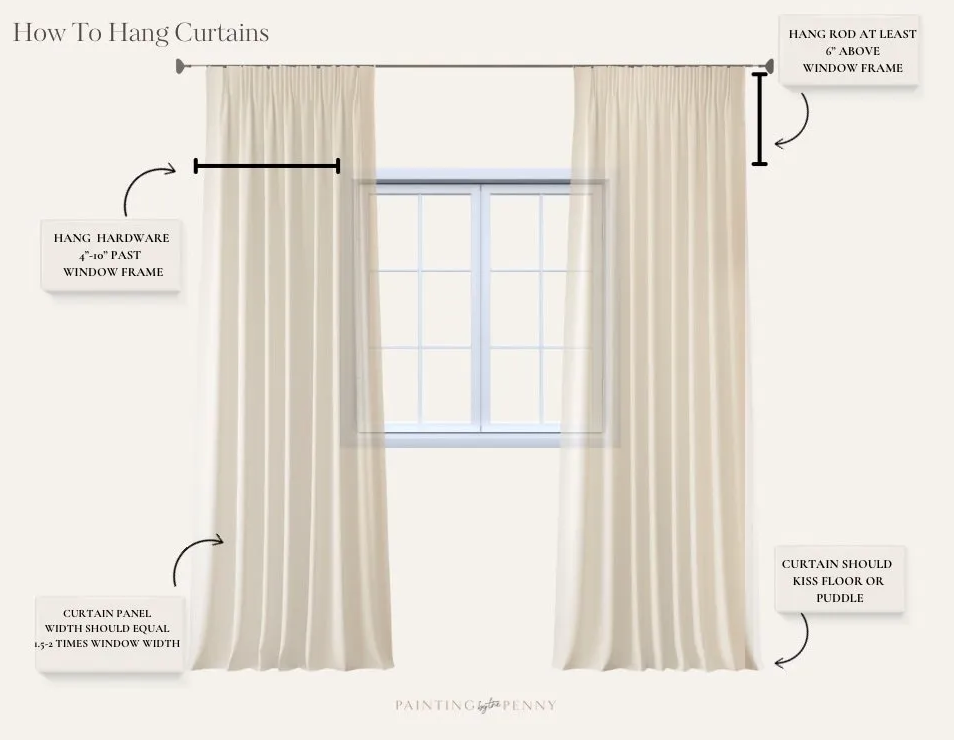 Curtains can make a huge difference too. Hang them high and wide, at least 8–10 inches above and outside the window. It makes your ceilings look taller and your room look bigger.