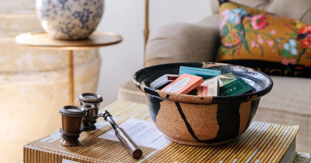 That little matchbook you brought home from a trip? Put it in a bowl on your coffee table. The books you love to flip through? Stack them up and use them as part of your decor.