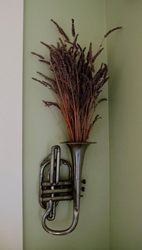 Get creative with your thrift finds. That old trumpet? Hang it on the wall rightside up and add flowers in it like a vase. A chipped liquor bottle? Fill it with colored water or flowers. Old doesn’t mean outdated—it means interesting.